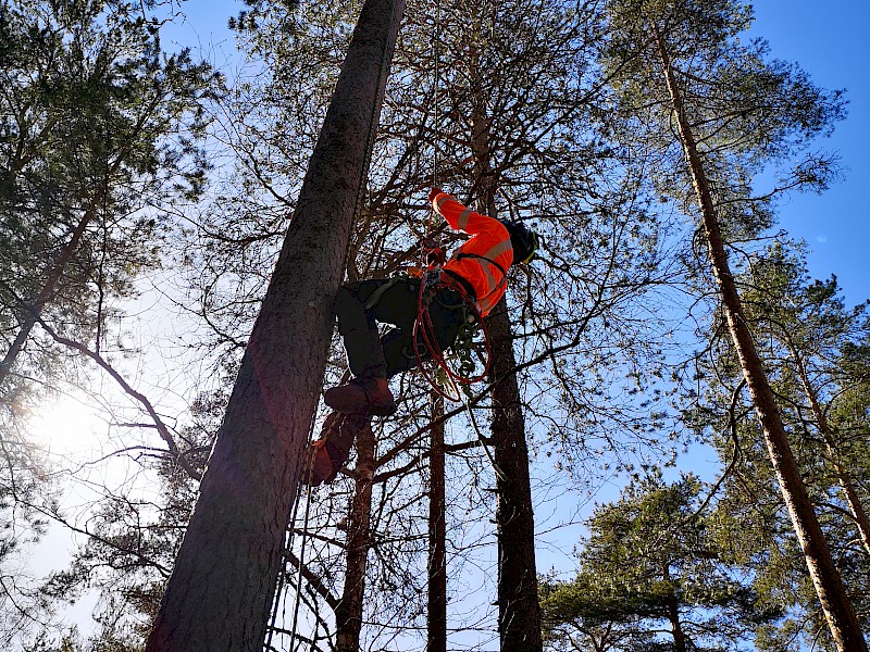 Puiden hoitotöissä ei käytetä piikkikenkiä vaan kiipeily tapahtuu täysin köysien varassa.