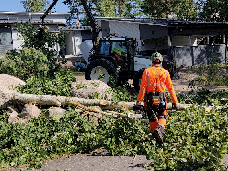 Palvelu laaditaan aina asiakkaan toiveiden mukaan. Voimme käydä vain kaatamassa puun ja antaa asiakkaan jatkaa siitä eteenpäin tai voimme hoitaa työn alusta loppuun asti. Tähän voi sisältyä esimerkiksi puiden kaataminen, oksien karsiminen, rungon paloittelu polttopuumittaan ja pihan siivoaminen. Myös risujen ja rungon poisvienti onnistuu yhteistyökumppaneidemme avulla.